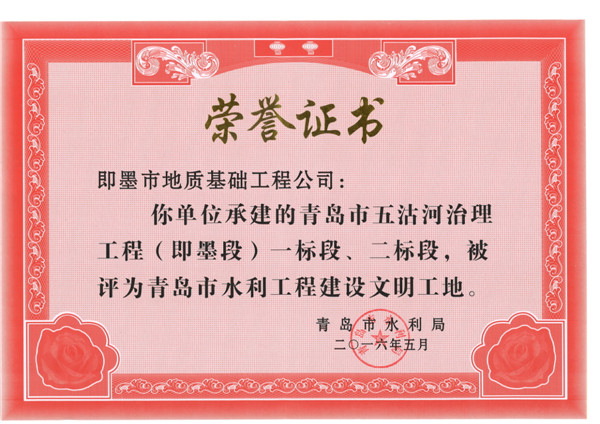 承建的青岛市沽河治理工程(即墨段)一标段、二标段、被评为青岛市水利工程建设文明工地